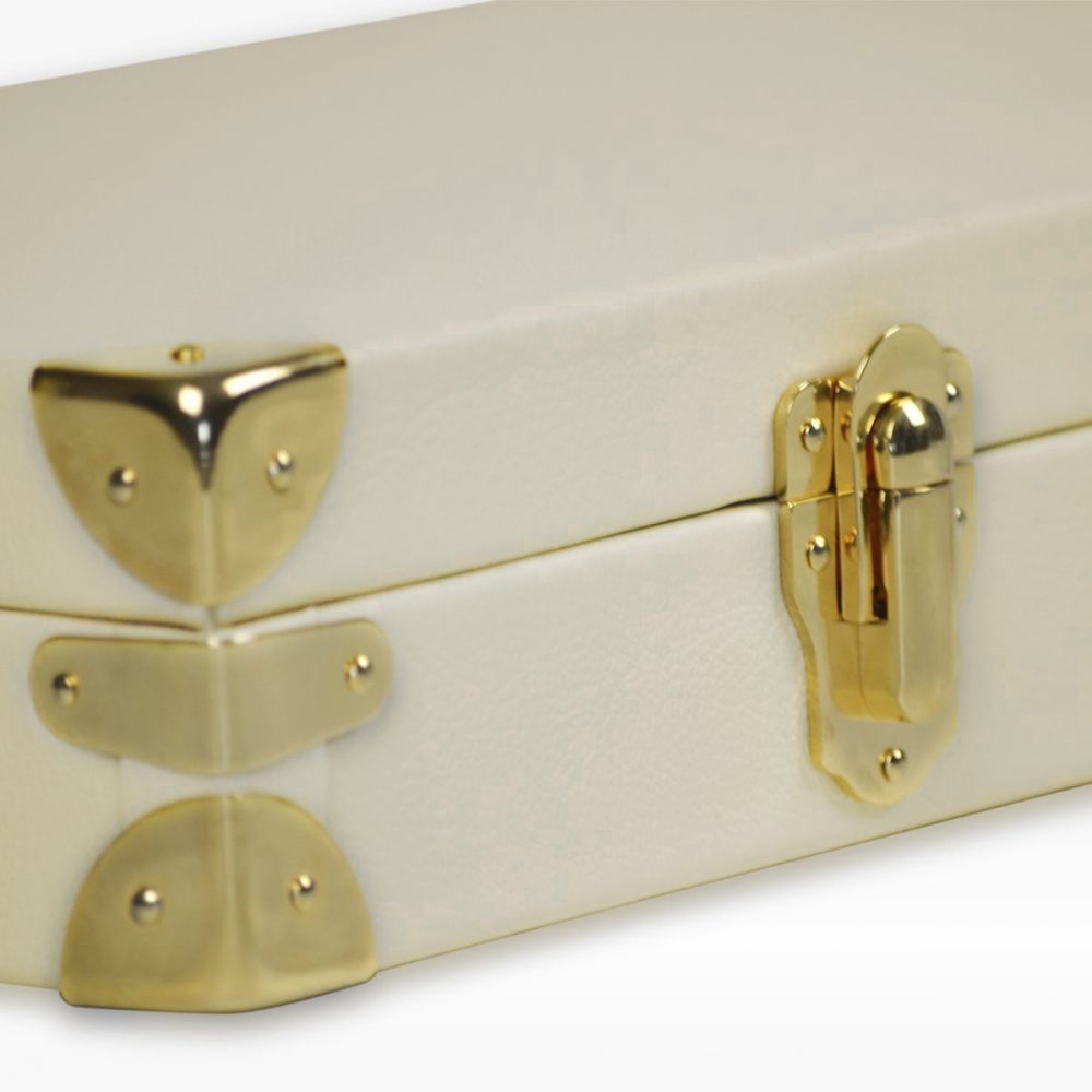 这款专为小提琴、中提琴和大提琴弓量身定制的6弓盒,采用坚固的木质制成,外覆以优雅耐用的小牛皮,可选米色、棕色或黑色。内部采用最高品质的米色麂皮绒超纤维。配备高安全性双机械锁和加大号真皮提手。锁具和金属部件提供镍色或24K镀金色可选。